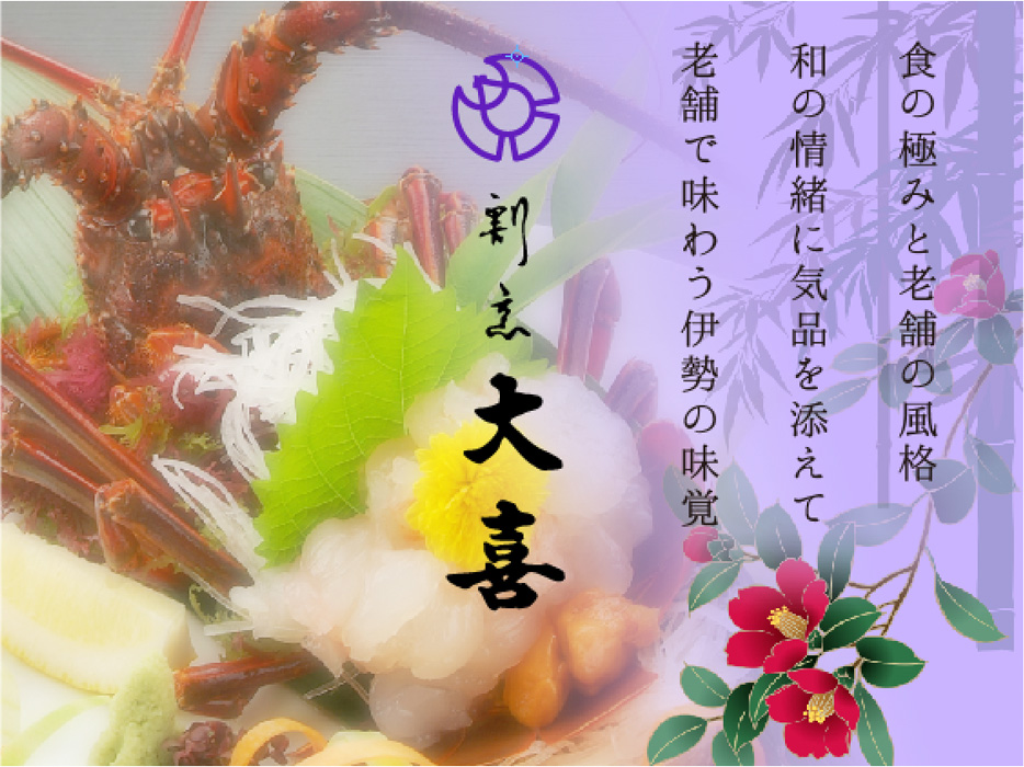 伊勢は恵まれた自然環境の中、豊富な山海の幸が集まる街です。 大喜は伊勢志摩の旬の素材を中心に、 和の情緒を込めたお料理と心を込めたサービスで お客様のかけがえのないひとときを演出いたします。